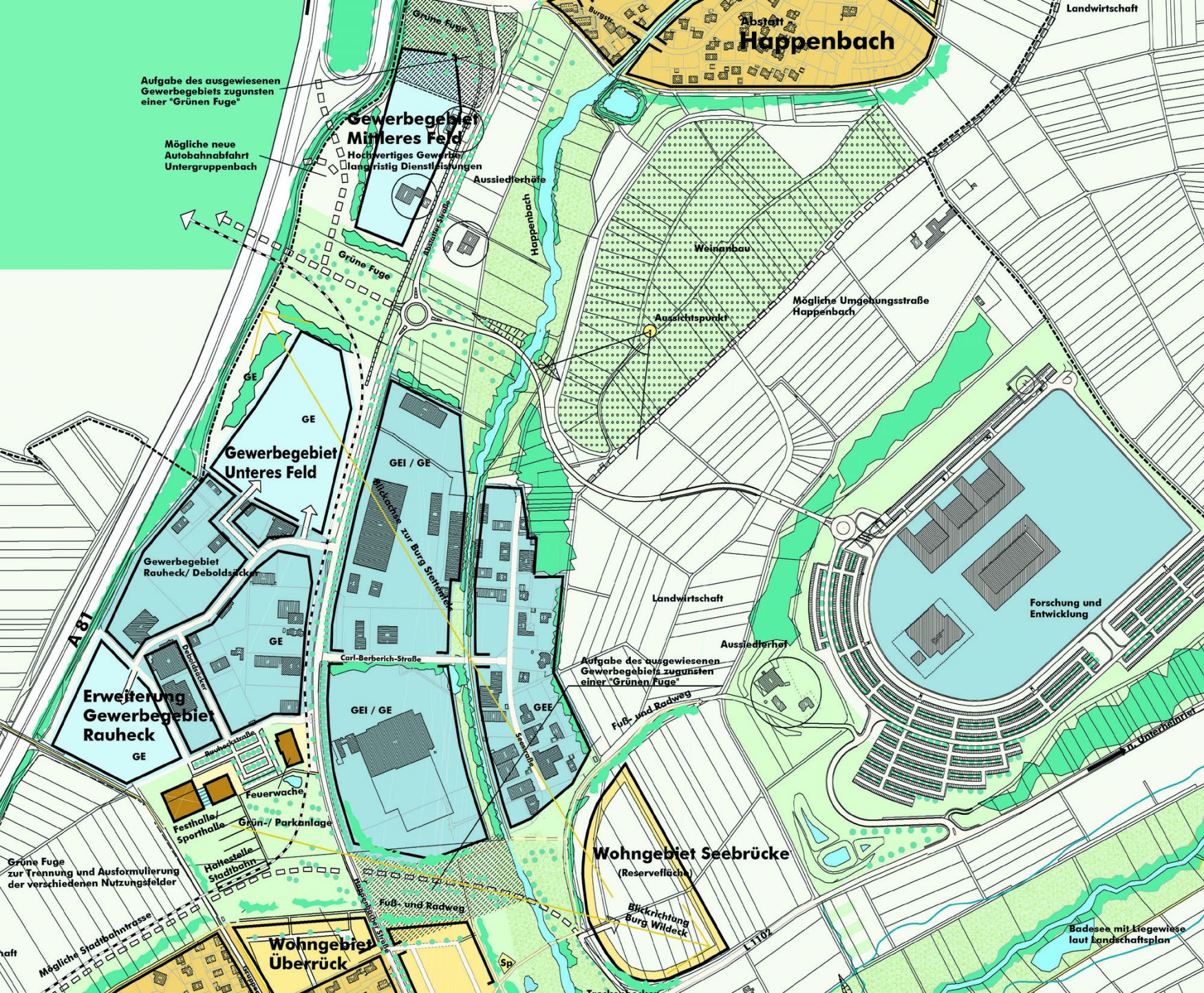 Weiterentwickeln der Wettbewerbsplanung. Planerische Vertiefung in Form städtebaulicher Entwürfe mit Erschließungs- und Bebauungsvarianten an wichtigen Stellen. Berücksichtigung zusätzlicher Themen (Verkehrsentwicklung z.B. Stadtbahntrasse, Festlegung potentieller Wohnerweiterungsflächen, Standortwahl Kultur- und Sporthalle). Zusammenführen der städtebaulichen Planung mit der Lärmprognose vom Büro Planung + Umwelt, Dr. Koch.