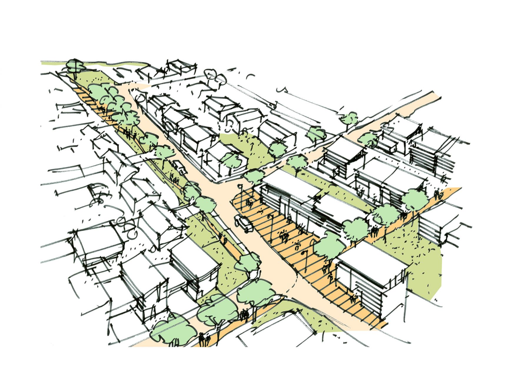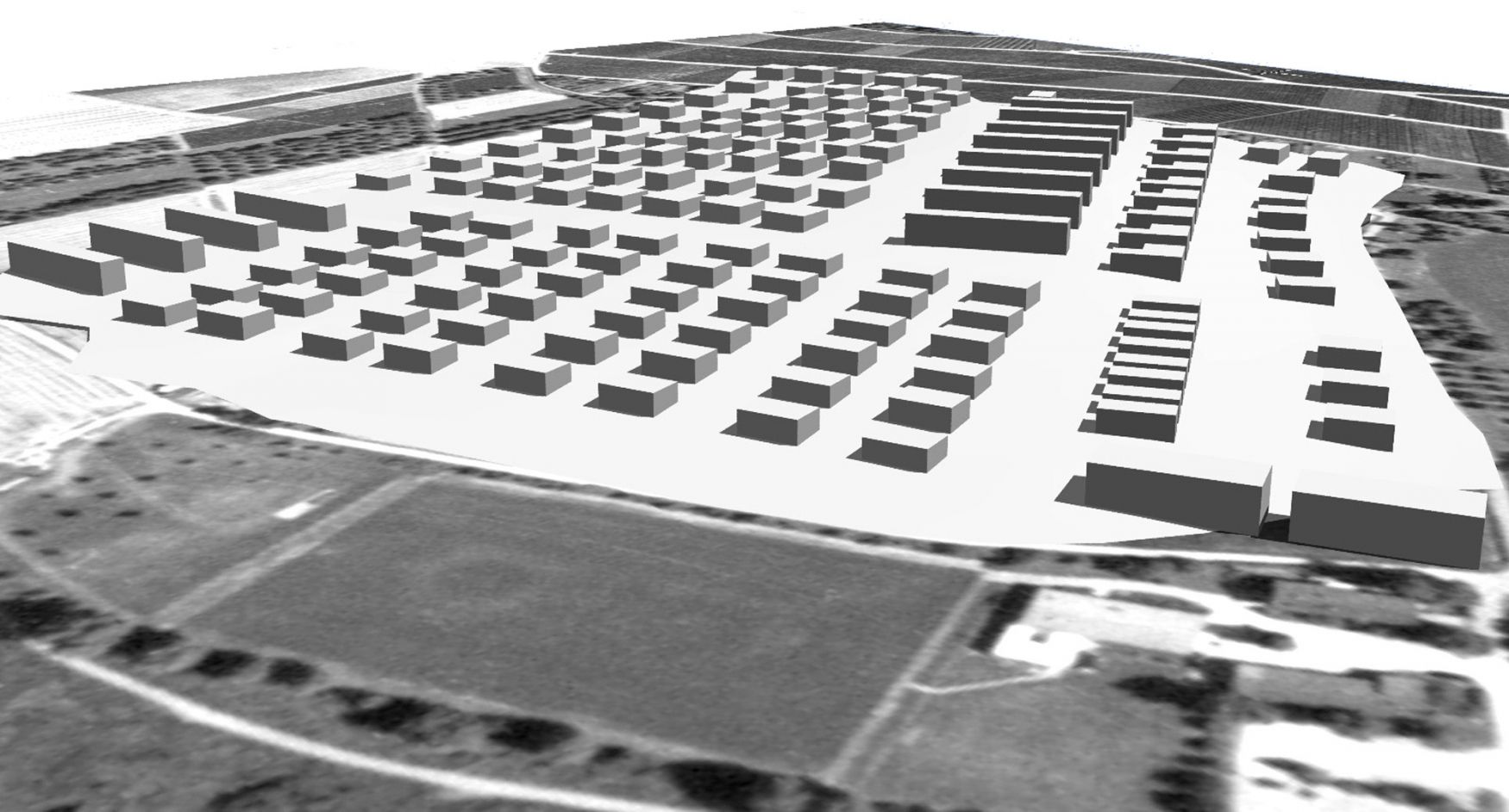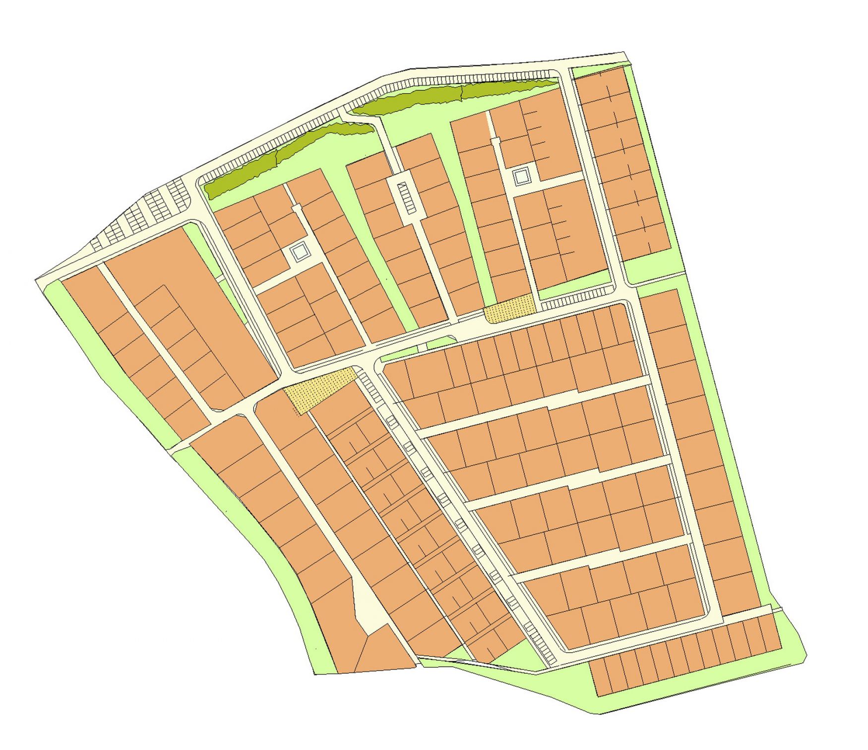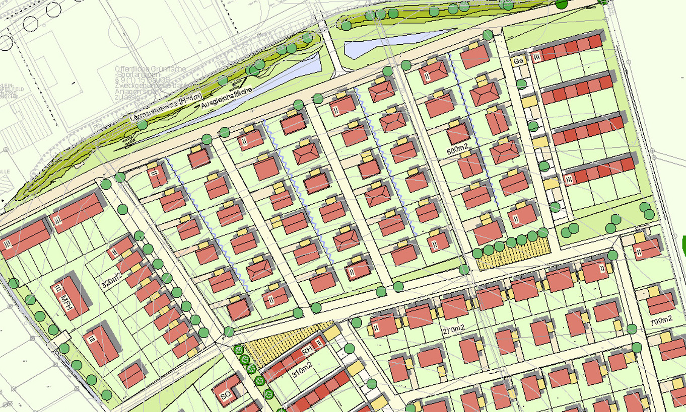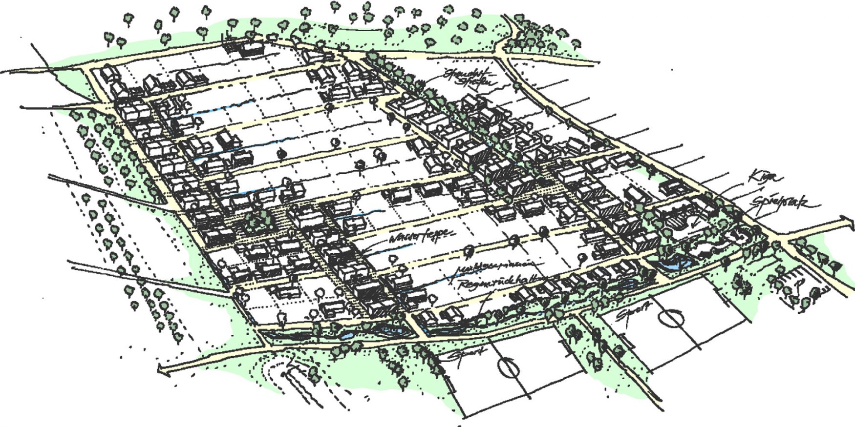 Unter dem Aspekt der Ausbildung eines reinen Wohngebietes mit vorwiegendem Anteil an frei stehenden Einzelhäusern versucht das Konzept, diese in klar ablesbare Quartiere oder „Felder“ zu strukturieren. Teilbereiche mit verdichteten Gebäudetypen werden festgelegt. In diesem städtebaulichen Rahmen entstehen als Gelenke öffentliche Plätze, die zur Orientierung und als Treffpunkte dienen und dem Gebiet eine eigenständige Prägung geben. Somit kommt dem öffentlichen Raum innerhalb des vorliegenden Konzepts eine entscheidende Bedeutung für die künftige Qualität des Gebiets zu.