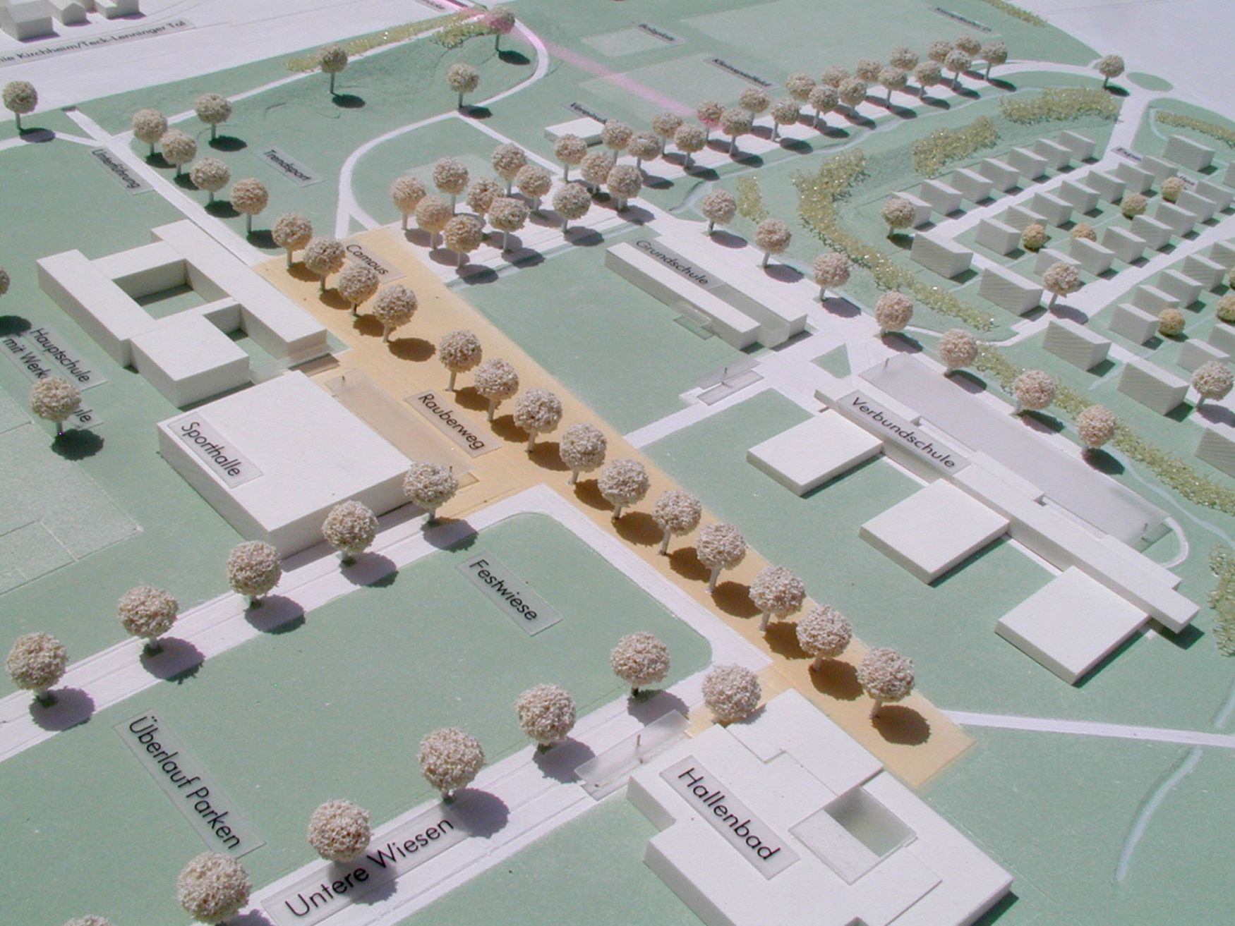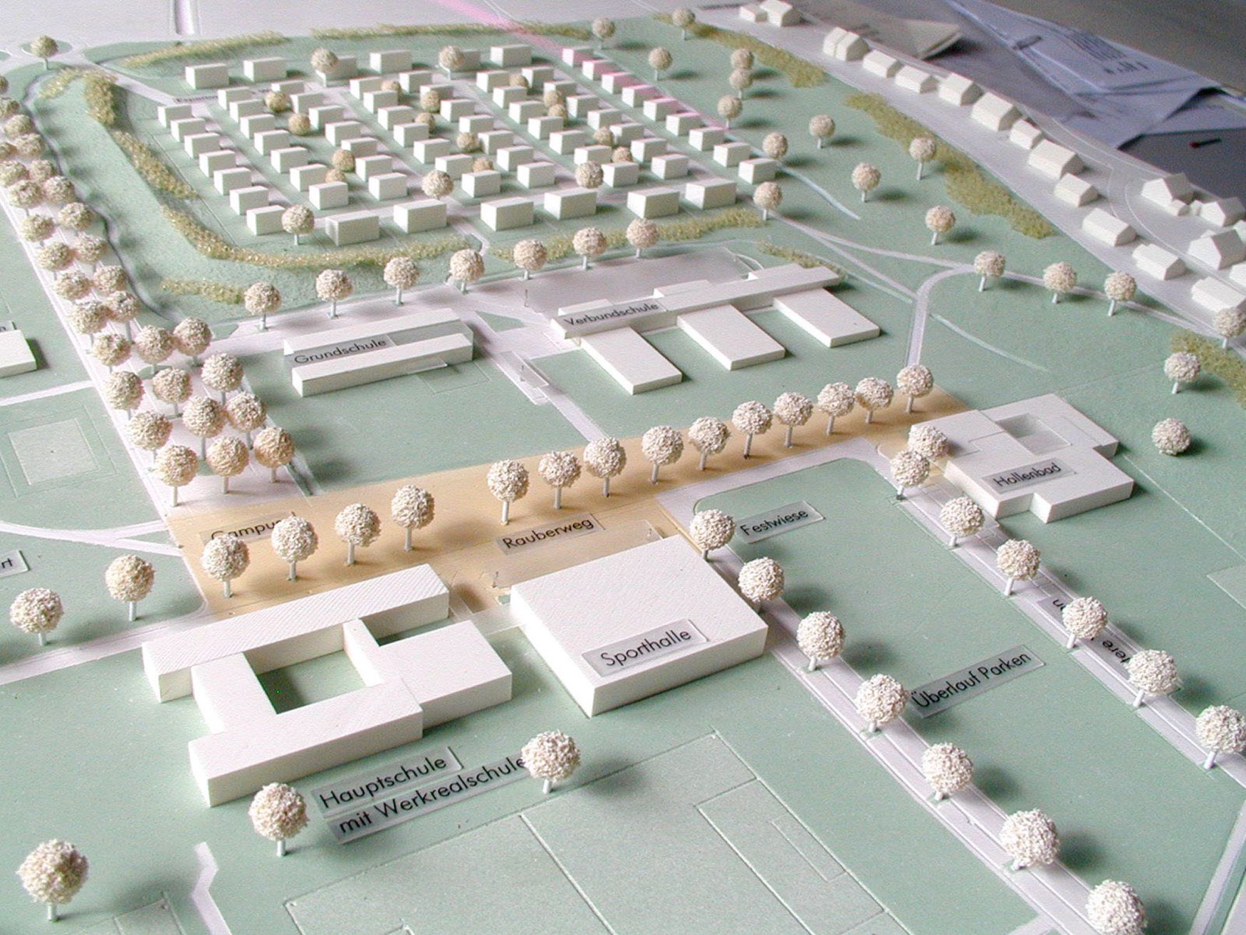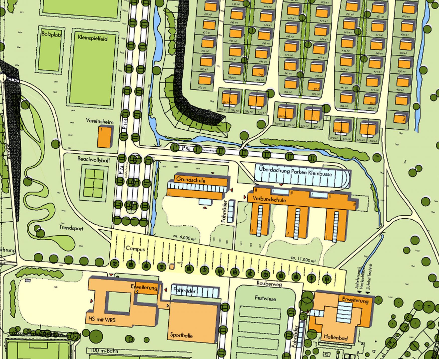 Die neuen Schulen bilden über einen gemeinsamen "Campus" mit der bestehenden Haupt- und Realschule, der Sporthalle und dem Hallenbad einen vernetzten Schulbereich, welcher als eigenständige städtebauliche Einheit funktioniert. Das experimentelle Wohnen mit Schwerpunkt Energie (Solarnutzung) ist als geschlossene Struktur nördlich der Schulen geplant. Die neuen Sportanlagen parallel zur B465 bilden eine grüne Fuge zum westlich gelegenen alten Ortskern.