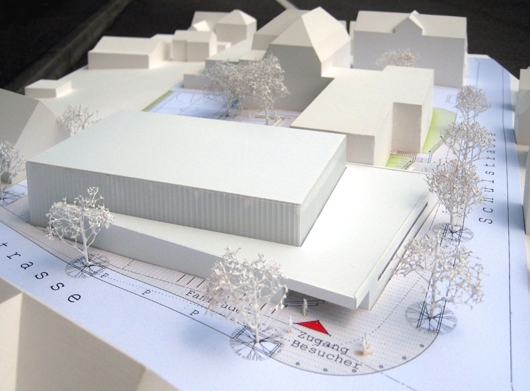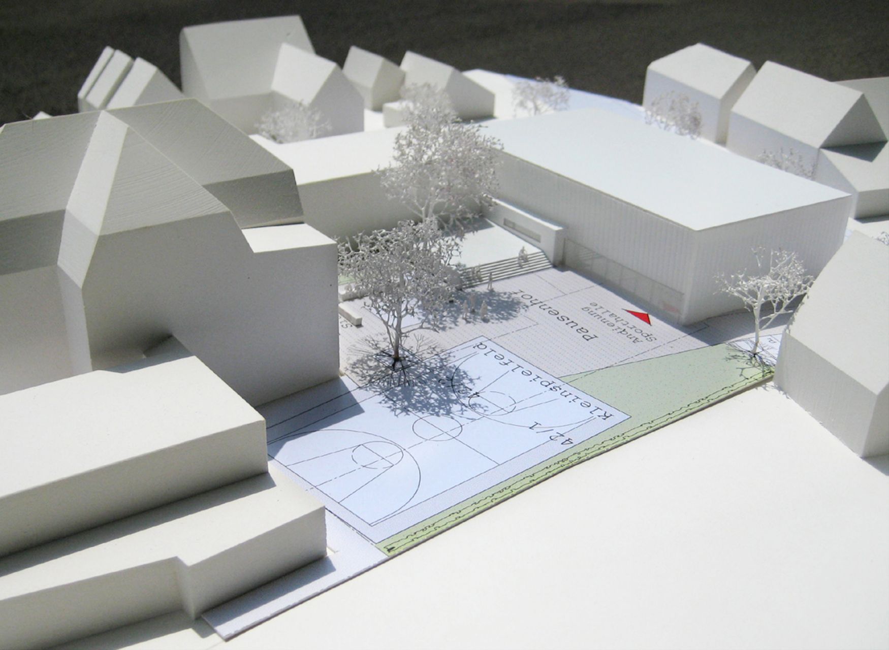 Die Sporthalle bildet an der Ecke Schul-/Poststraße eine wichtige Raumkante. Es entsteht dadurch ein innenliegender zur Straße hin abgeschirmter Schulhof und im Straßenraum eine bauliche Abgrenzung. Durch den eingeschossigen zum Straßenraum hin vorgelagerten Baukörper entsteht ein maßstäblicher Bezug zur umgebenden Bebauung. Der kompakte und klare Baukörper fügt sich selbstbewußt und harmonisch in das Gesamtgefüge ein. Es wurde ein einfacher und zurückhaltender Baukörper geformt. Die vorwiegend aus Profilglas ausgebildete Fassade und das begrünte Flachdach lassen den Baukörper kubisch und sachlich wirken. Der in unterschiedlichen Zeitabschnitten gewachsene Schulkomplex wird durch den Neubau vervollständigt.