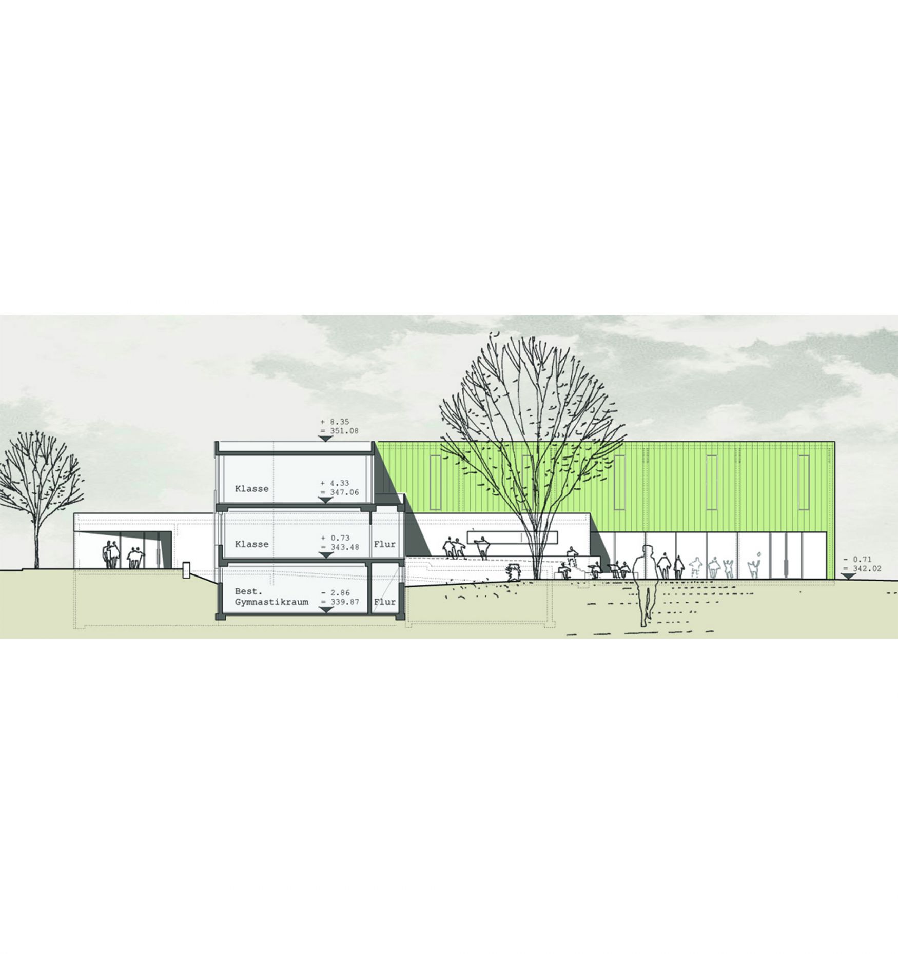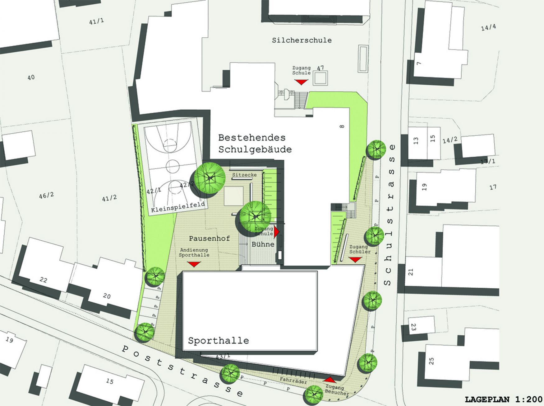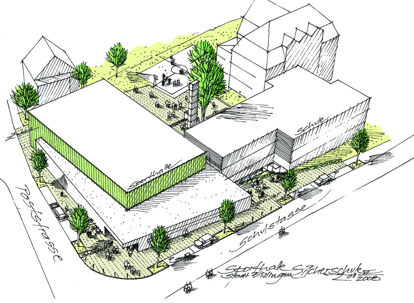 Die bestehende Silcherschule wird um die neue Sporthalle ergänzt bzw. erweitert. Der neue Baukörper wird im südöstlichen Grundstücksbereich an den bestehenden Schulkomplex angebaut.