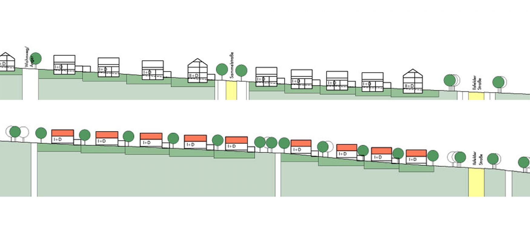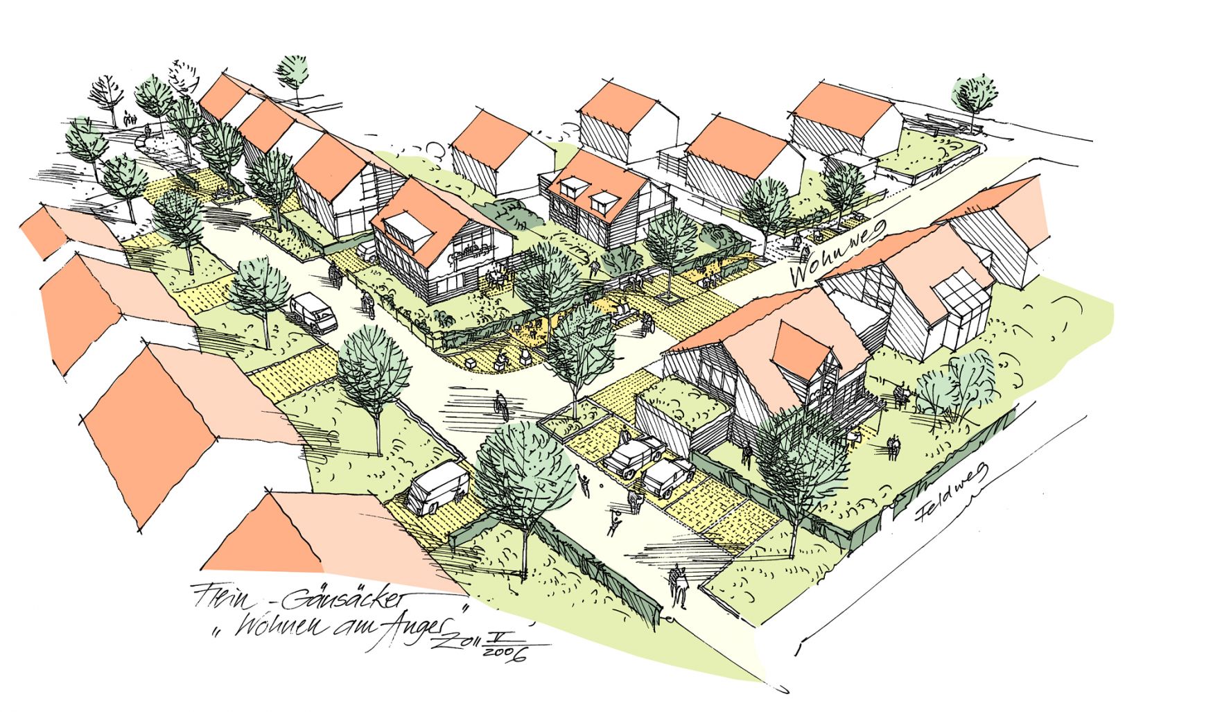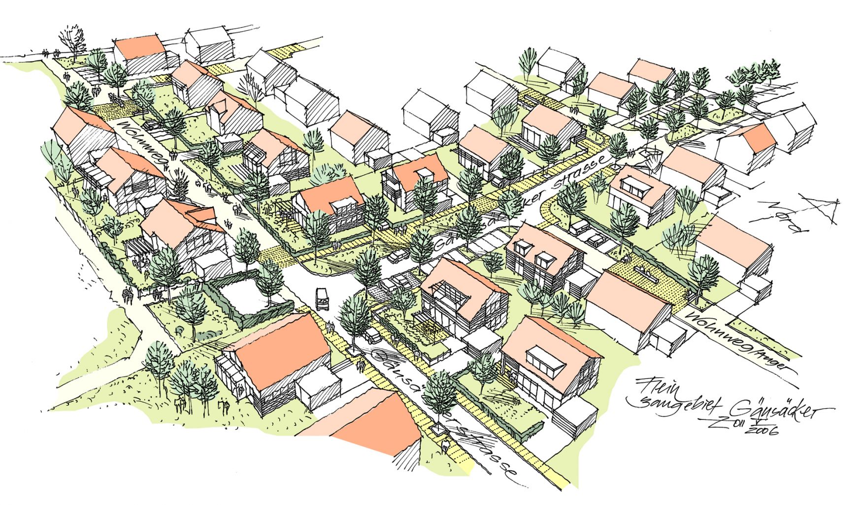 Städtebaulicher Entwurf einer Wohnbebauung am südlichen Ortseingang in Verbindung mit Bushalt und Kreisverkehr. Arrondierung der momentan den südlichen Ortsrand bildenden Wohnbebauung.