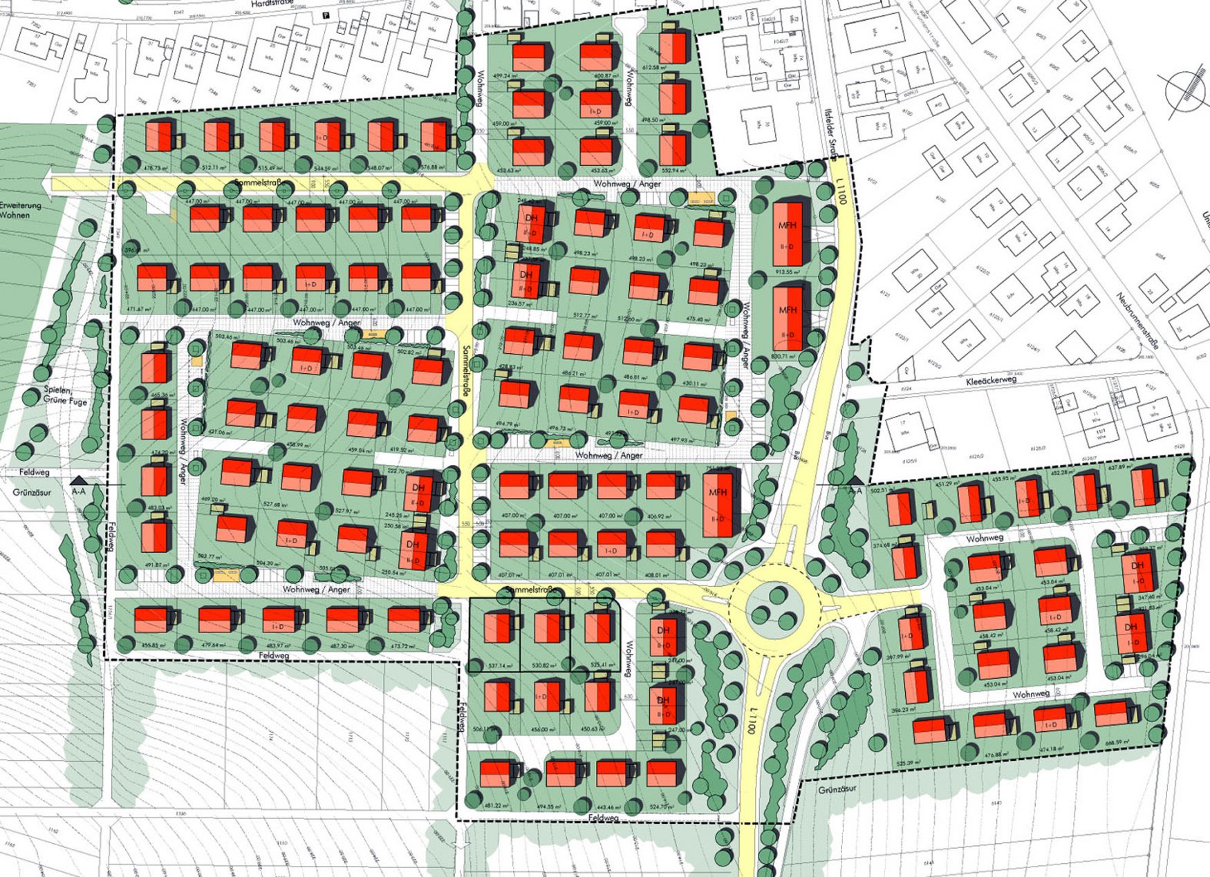Erste Umsetzung der im Gemeindeentwicklungskonzept ausgewiesenen Flächen, um dem erhöhten Bedarf an Wohnraum zu entsprechen. Erschließung der neuen Baufelder über eine gestaltete Kreisverkehrsanlage mit dem Ziel, die Attraktivität des südlichen Ortseinganges zu erhöhen.
