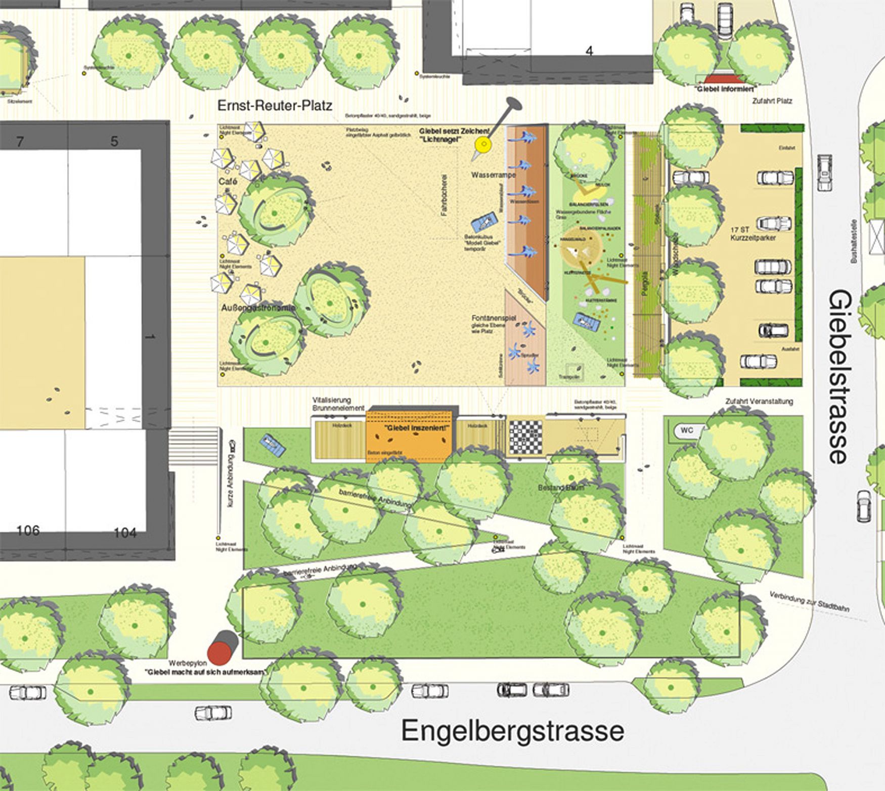 Das Zentrum des Stadtteils bildet der Ernst-Reuter-Platz, der in seiner Qualität und in seiner Bedeutung aufgewertet werden soll. Ziel ist es, dass alle Bevölkerungsgruppen und alle Generationen auf dem Platz die Möglichkeit haben, sich zu treffen, zu spielen und den Stadtteil Giebel in Bewegung zu versetzen.