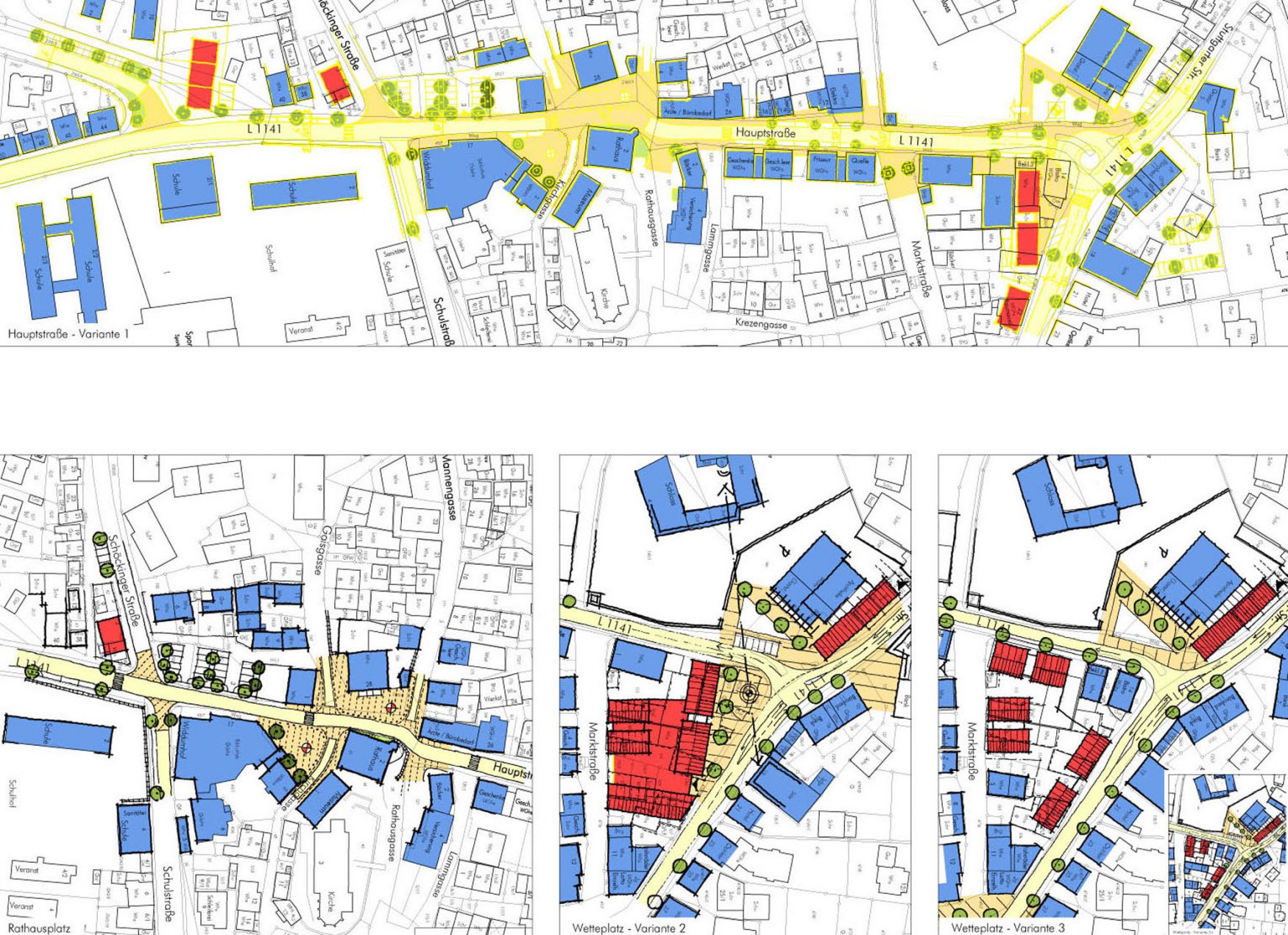 4 Plätzekonzept mit attraktiven neuen Aufenthaltsqualitäten. Stärkende Maßnahmen des kleinteiligen innerörtlichen Geschäftsbereichs. Eingrenzung der Entwicklungsschwerpunkte. Quartierssanierung mit neuer räumlicher Fassung, Platzgestaltung und Berücksichtigung ortsbildprägender Blickbeziehungen. Rückbau des vorhandenen Straßenprofils in den künftig vom Verkehr entlasteten Hauptstraßen. Skizzenhafte Gestaltungsvarianten für aktuelle Planungsbereiche.