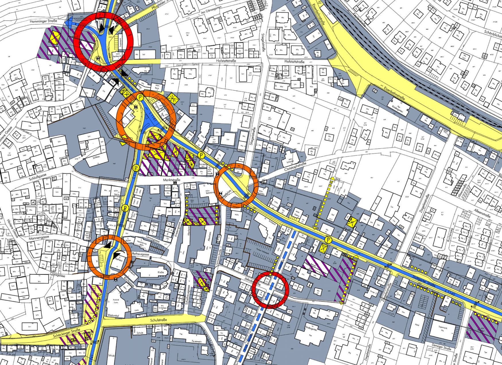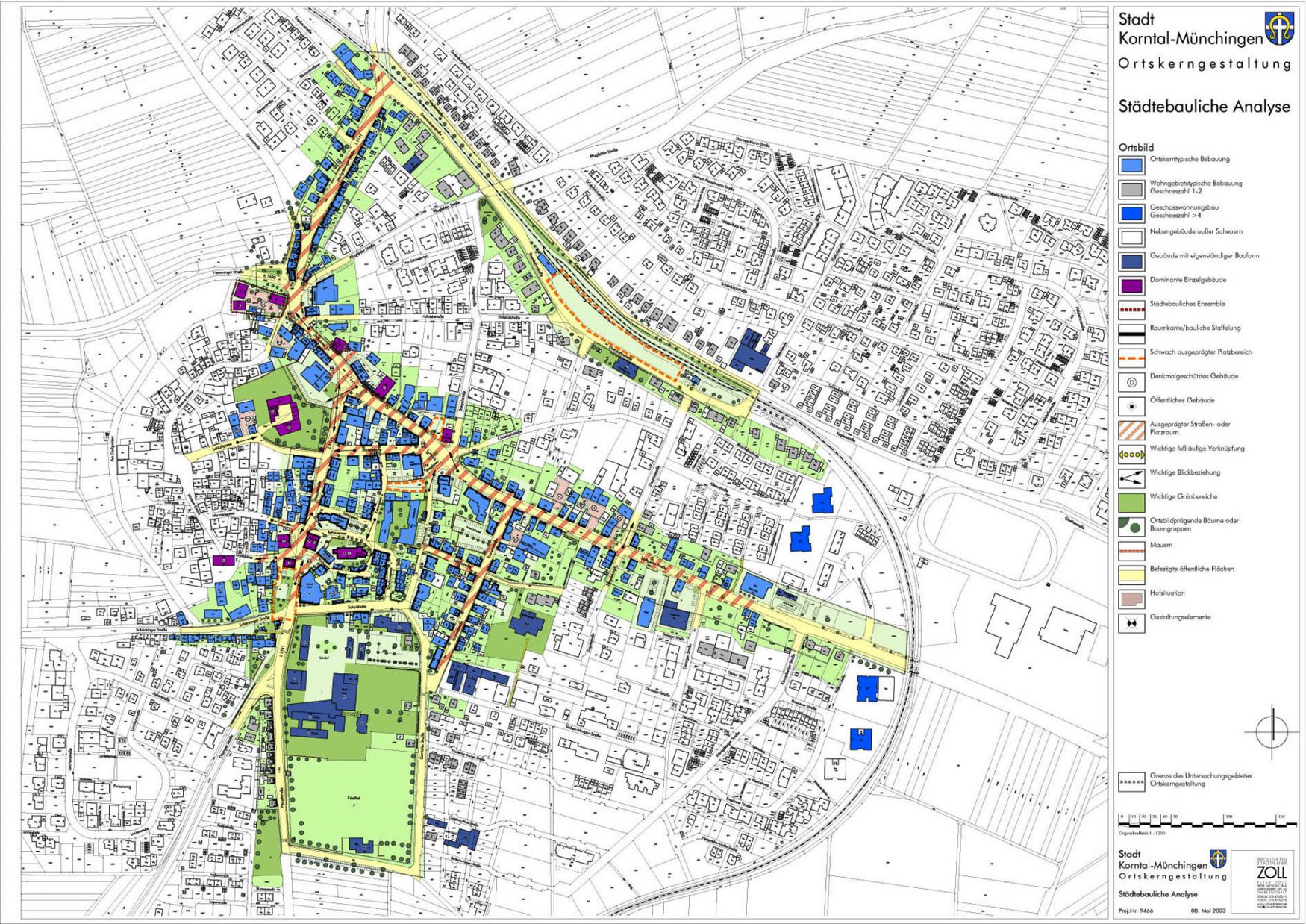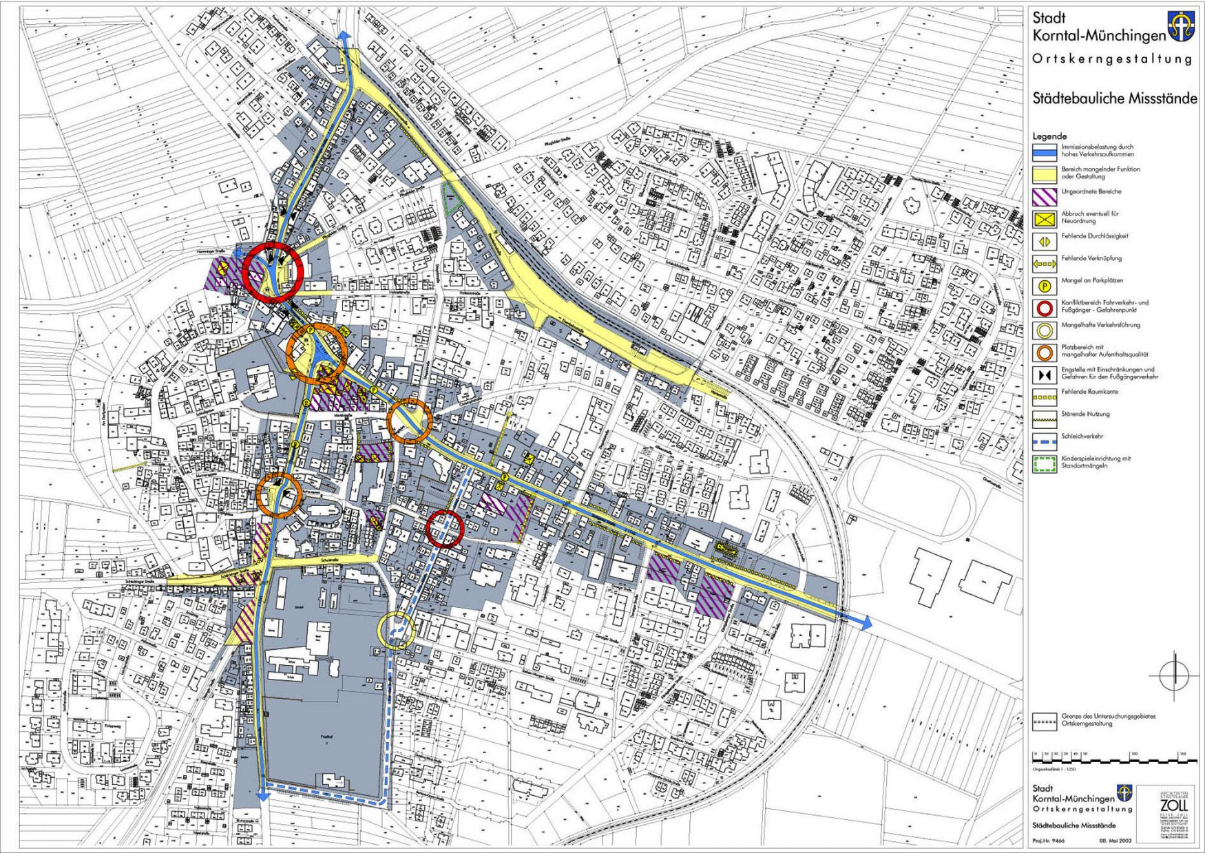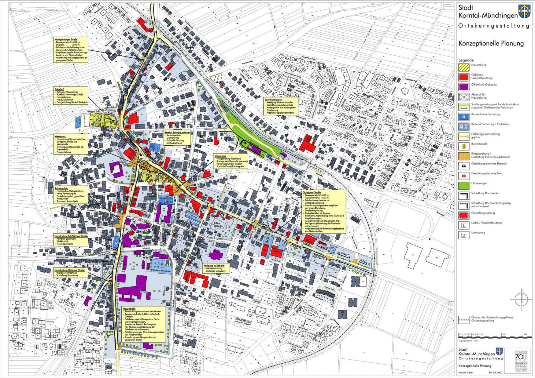Städtebauliche Rahmenuntersuchung für eine neue Straßenraumgestaltung im Ortskern von Münchingen. Ausgelöst durch die Realisierung einer Ortsumgehung. Darauf aufbauend, konkrete Neugestaltung von Platzbereichen und Straßenseitenbereiche bis zur Ausführung. Städtebauliche Analyse des Ortskerns hinsichtlich Baustruktur, Freiflächen, öffentlicher Raum, Versorgung, Infrastruktur sowie positiven städtebaulichen Merkmalen und städtebaulichen Missständen. Ausarbeitung eines Programmplans mit Aussagen zur künftigen innerörtlichen Entwicklung, Schwerpunktbildung, sowie einer konzeptionellen Planung mit übergeordneten Aussagen für die konkrete Straßenraumgestaltung.