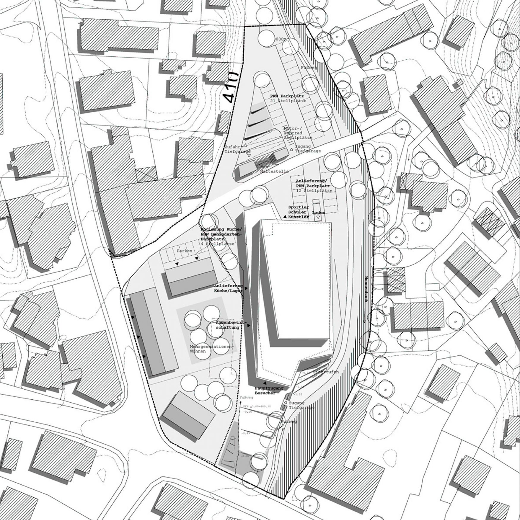 Wie durch den Bach freigespülte “Schichten” liegen die Ebenen des Gebäudes und die der Außenanlagen übereinander. Zueinander verdreht und verschoben verzahnen sie sich mit dem Grundstück und finden zu ihrer endgültigen Lage. Die Form des Gebäudes reagiert sowohl auf die Besonderheiten des Ortes, als auch auf die internen Funktionen. So orientiert sich die Halle nach Osten und macht durch ihre großzügige Verglasung die durchgrünte Uferzone des Nonnenbachs spürbar. Das der Halle vorgelagerte Foyer ist nach Süden ausgerichtet und schafft durch seine Auskragung im OG einen attraktiven Hauptzugang.