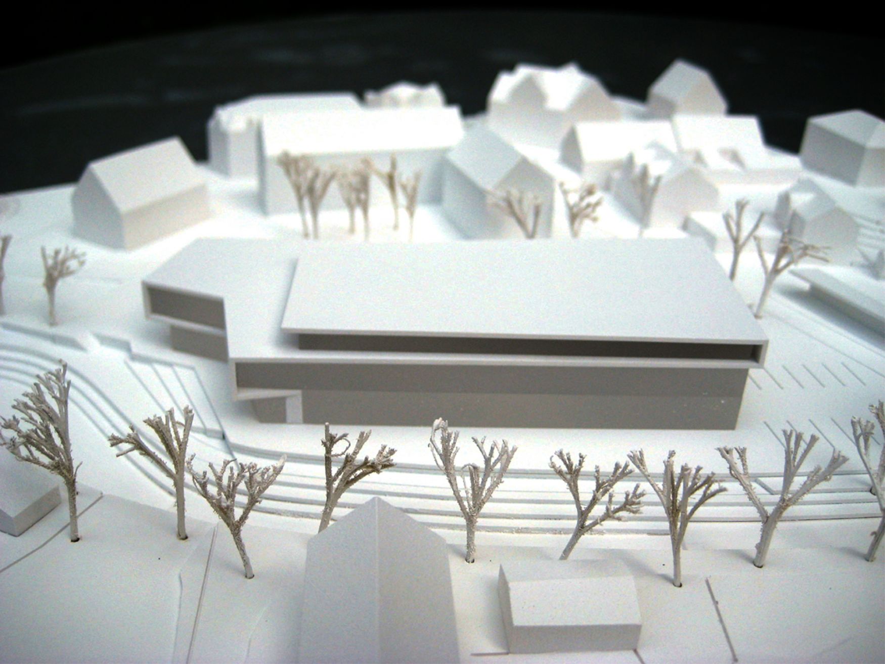 Entlang des innerstädtischen Grünzugs am Nonnenbach befindet sich das Planungsgebiet für den Neubau der Mehrzweckhalle. Lage und Form der neuen Halle wurden so entwickelt, dass sich der Baukörper im Ortsbild präsentiert aber auch die notwendige Distanz zu den angrenzenden Privatgrundstücken im Westen sowie zum Grünzug einhält.