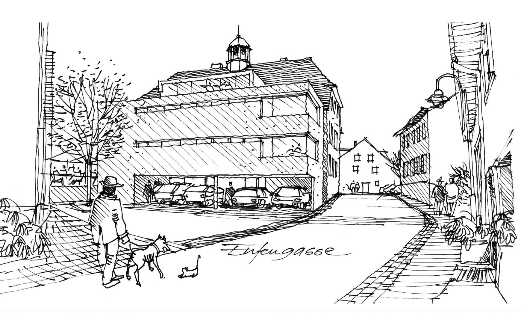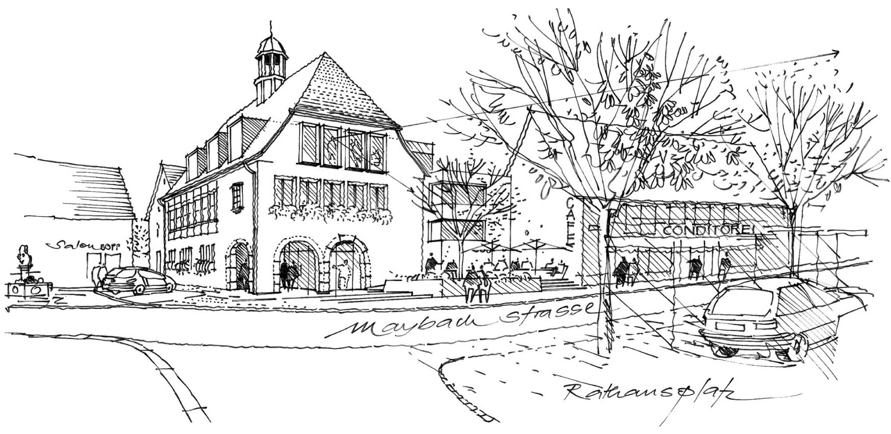 Zwischen den Baukörpern wird eine gläserne Fuge ausgebildet, in der als verbindendes Element die Erschließung aller Ebenen von Alt- und Neubau durch eine Treppe und einen Aufzug erfolgt. An der Ostseite entsteht eine großzügige Cafe-Terrasse mit Orientierung zum Rathausplatz.
