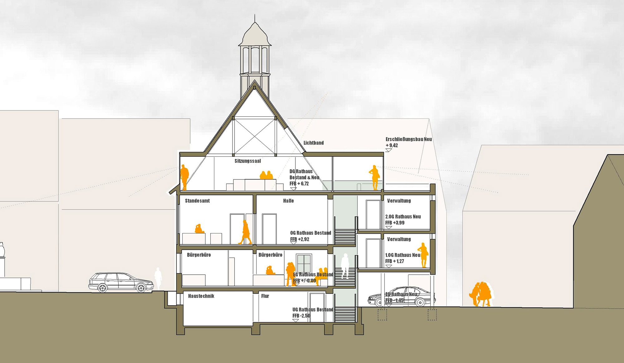 Das bestehende Rathaus-Hauptgebäude wird freigestellt. Die bestehenden Anbauten werden durch einen neuen, parallel zum Bestand orientierten Baukörper ersetzt.
