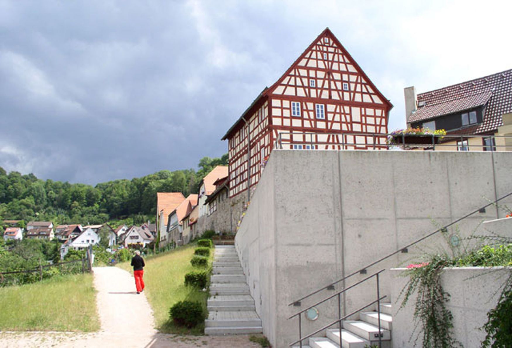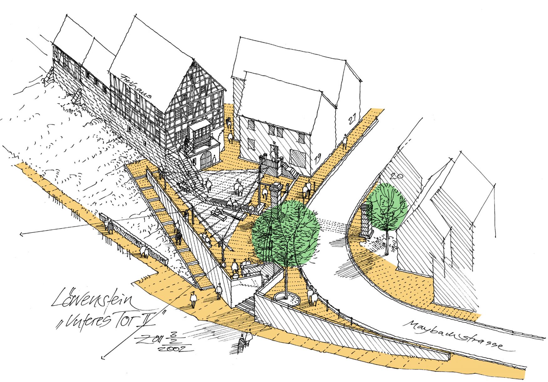 Die abgängige Bebauung am Stadteingang Unteres Tor bietet die Chance zu einer attraktive Aufenthaltsfläche mit spektakulärem Blick in die Landschaft der Löwensteiner Berge. Der Verlauf der Stadtmauer ist durch zwei Platzniveaus ablesbar, wodurch auch die Bereiche innerhalb und außerhalb der Stadtmauer definiert sind. Symbolisch sind zwei Stadttorpfeiler neu errichtet worden. In der Nacht wird die Stadtsilhouette sowie das dominante freigestellte Freihaus weithin aus der umgebenden Landschaft durch eine Lichtinszenierung untermalt.