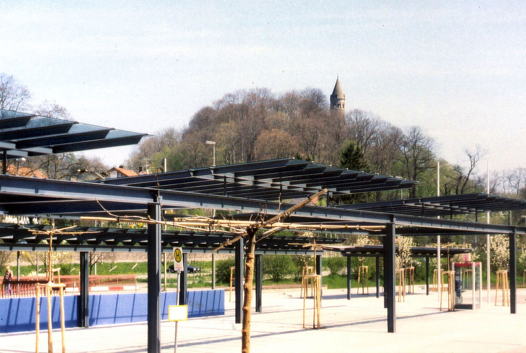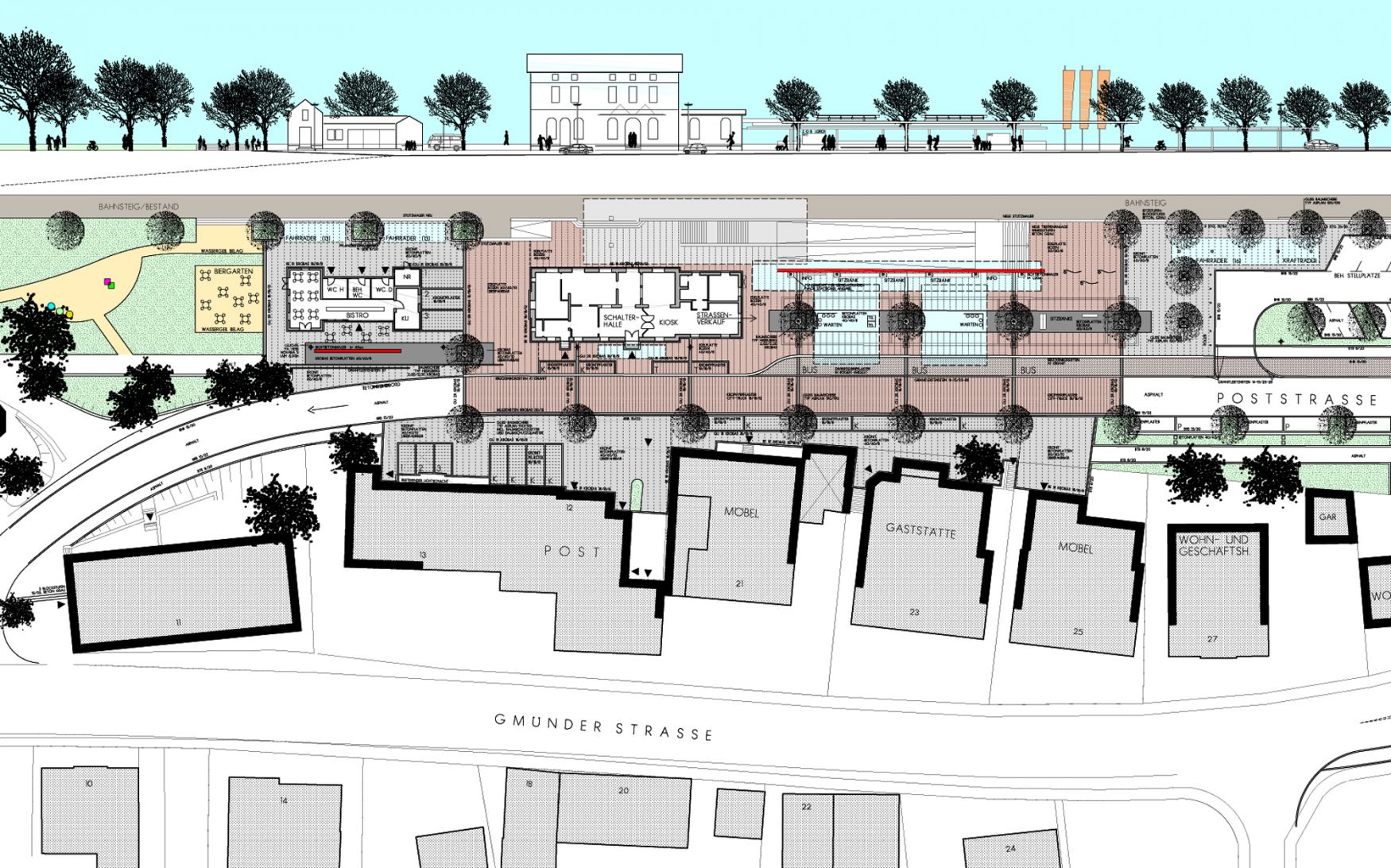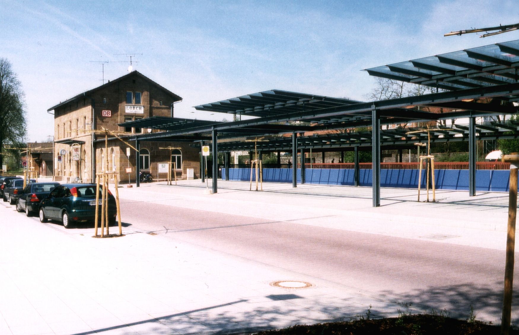 Im Bereich des Bahnhofs wurde eine funktionale Nutzungsschiene entlang der Bahnlinie Stuttgart - Aalen geschaffen. Die verschiedenen Funktionen Busbahnhof, Wartebereiche für Bus und Bahn, Fußgängerunterführung, Parkplätze, Fahrradabstellflächen, Gastronomie und Grünanlagen werden logisch geordnet und gestalterisch miteinander verknüpft.