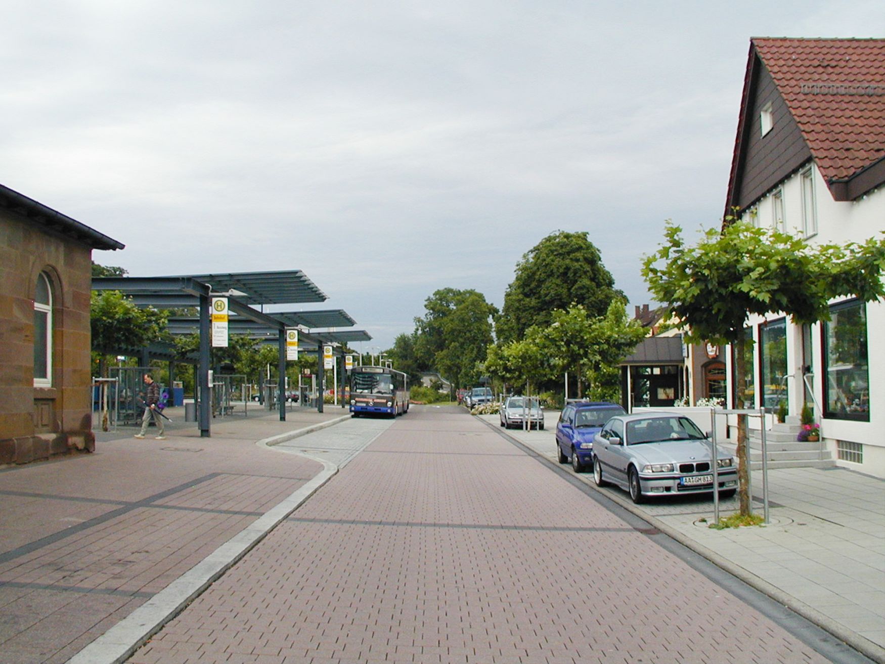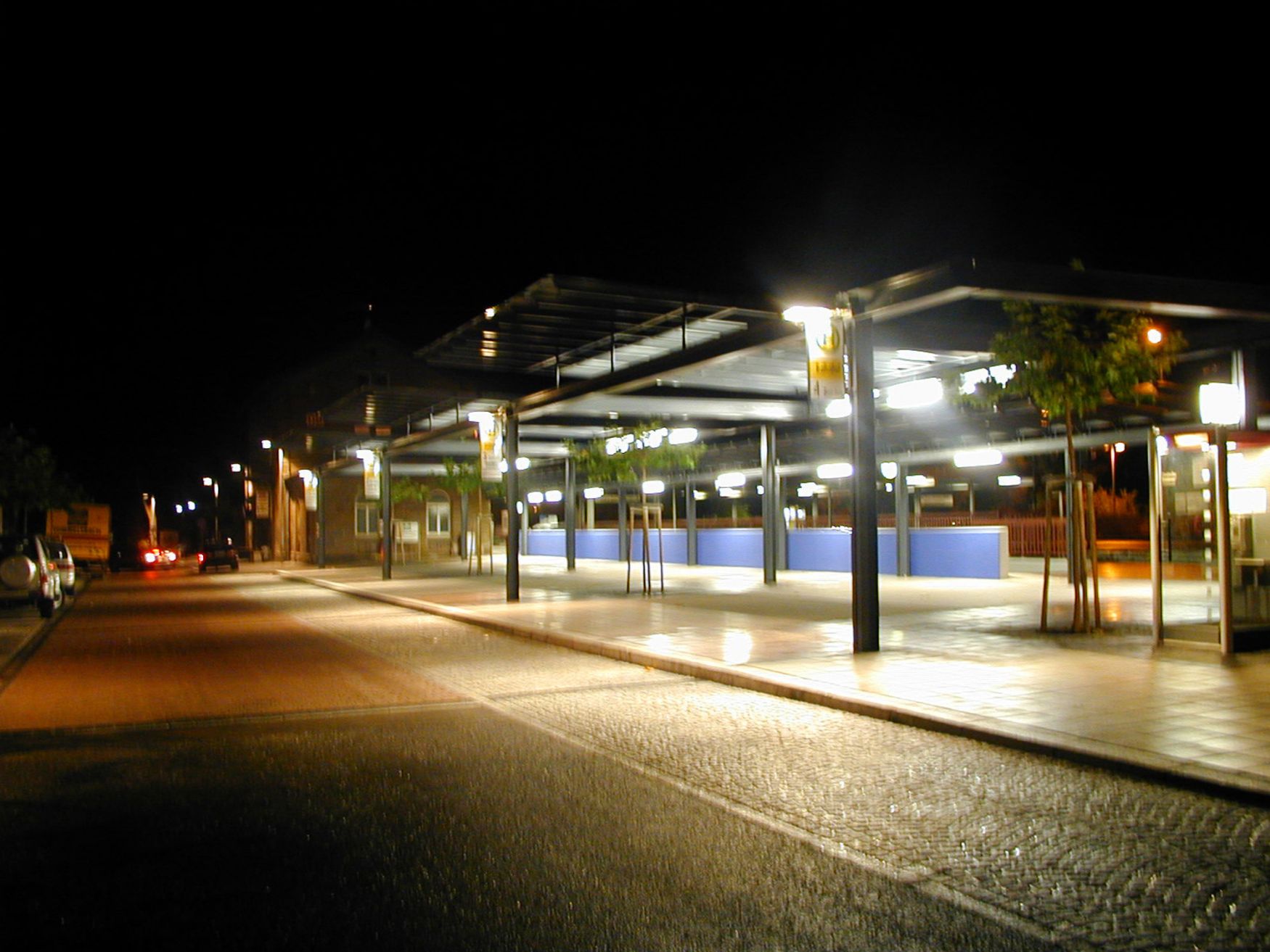 Straßenbau mit Kreisverkehr, Park and Ride Parkplätze, Busbahnhof mit überdachtem Wartebereich, Gastronomie im Bahnhofsnebengebäude mit Biergarten und Grünanlagen.