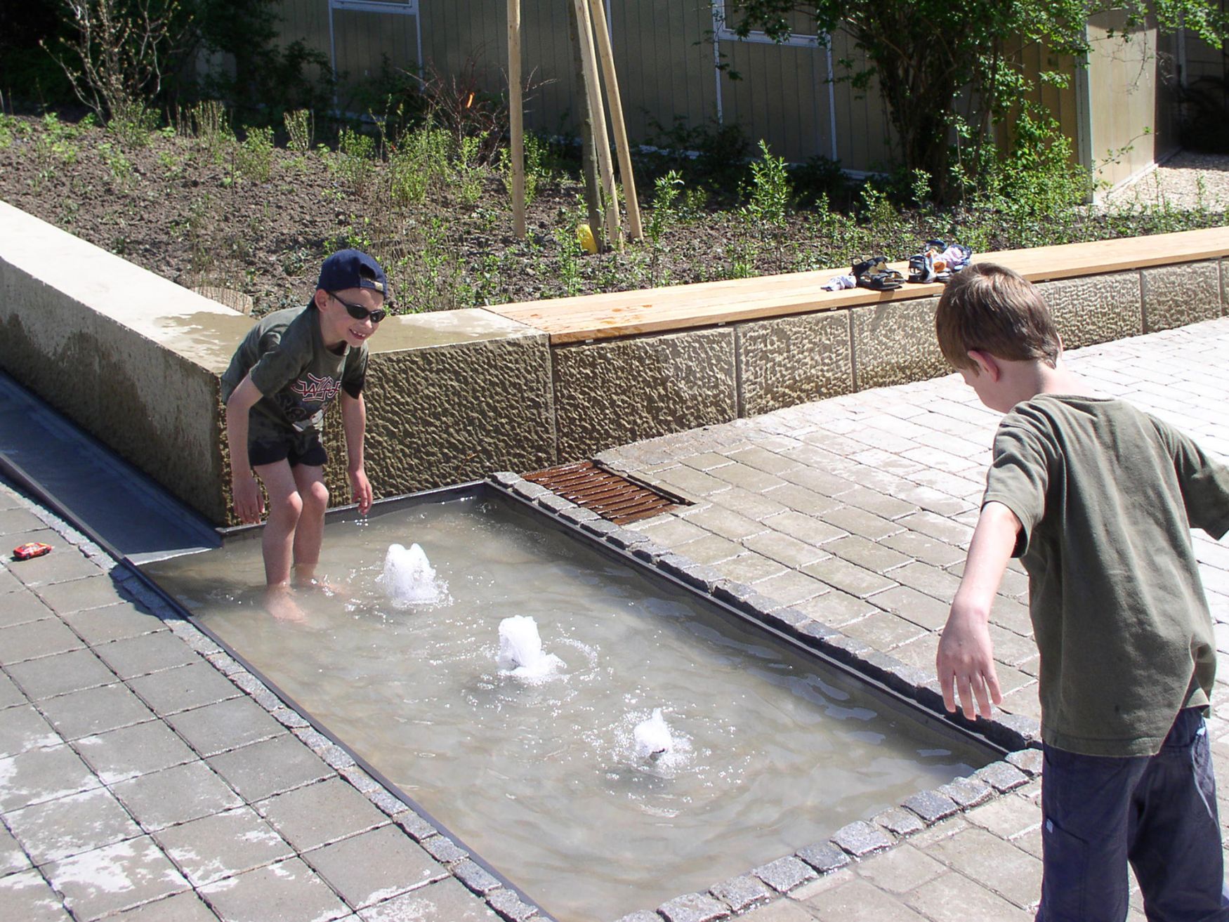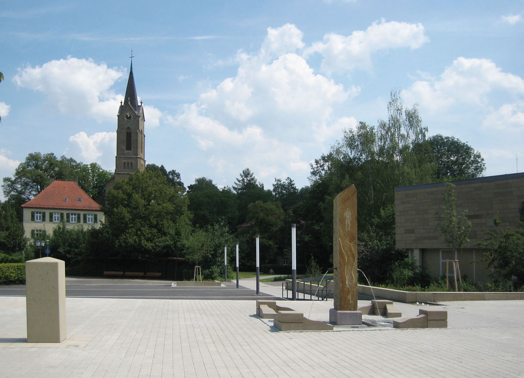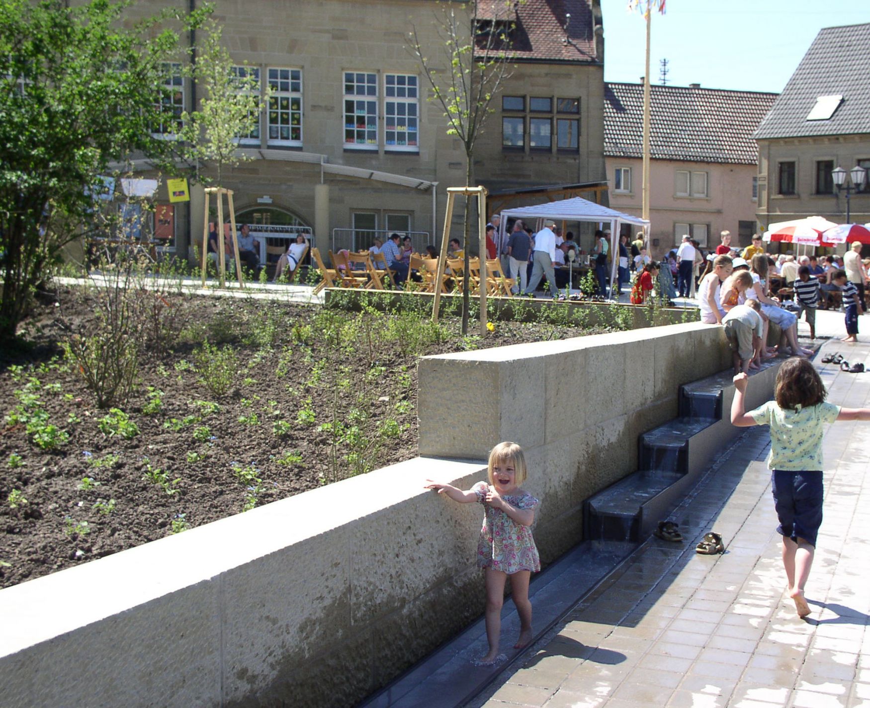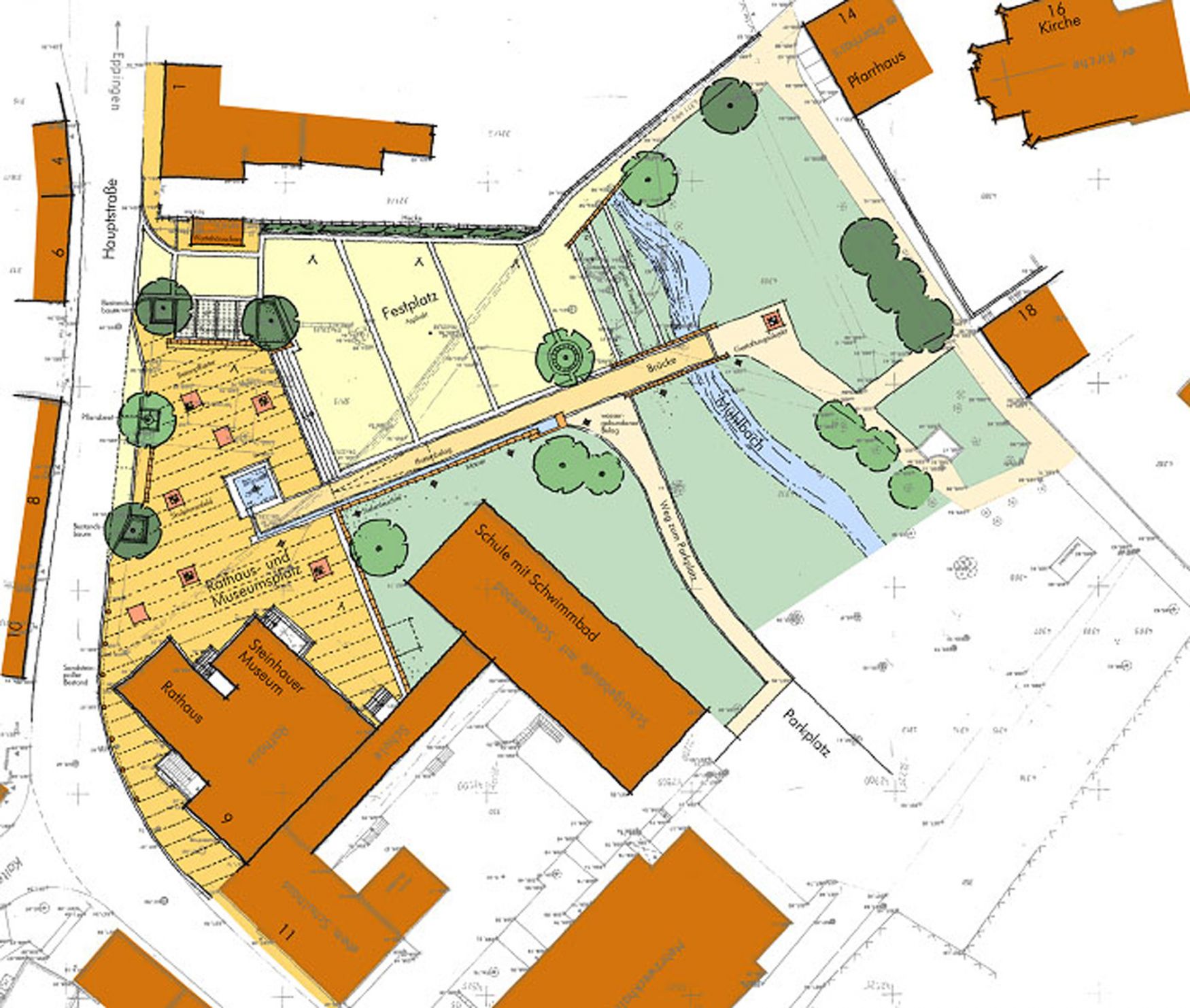 Schaffung einer nicht befahrbaren hoch attraktiven Platzfläche vor dem Rathaus mit Aufstellfläche für Sandsteinprodukte/Skulpturen und neuem Brunnenstandort im mittleren Platzbereich.