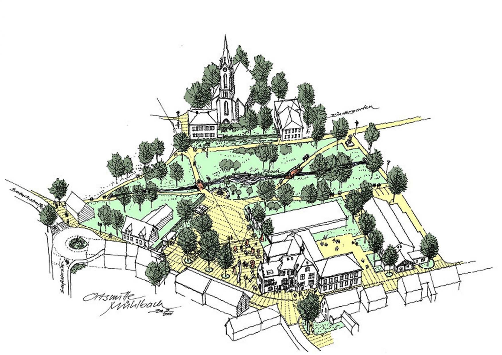 Optische und niveaumäßige Trennung des nördlichen und südlichen Bereichs durch Stufen/Rampenanlage und räumlicher Fassung mit Baumreihe und Mauereinfassung. Übergang zum Parkbereich mit neuer Wegführung.