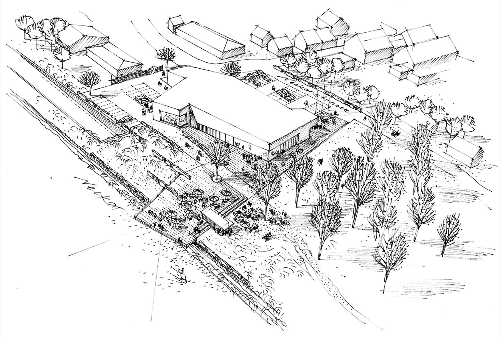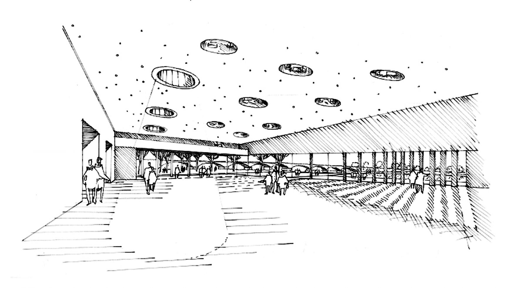 Durch die leicht zueinander eingedrehten Fassaden wendet sich das Gebäude zu den attraktiven Aussenbereichen hin und fängt diese ein. Das Gebäude gliedert sich dadurch in einzelne Sektoren und ist damit in seiner Ausrichtung wenig bestimmt. Um eine hohe Nutzungsflexibilität der Festhalle mit den Nebenräumen und dem Aussenraum zu bieten, sind alle wesentlichen Nutzungen ebenerdig angeordnet. Dies verspricht auch bei der Erstellung ein hohes Maß an Wirtschaftlichkeit.
