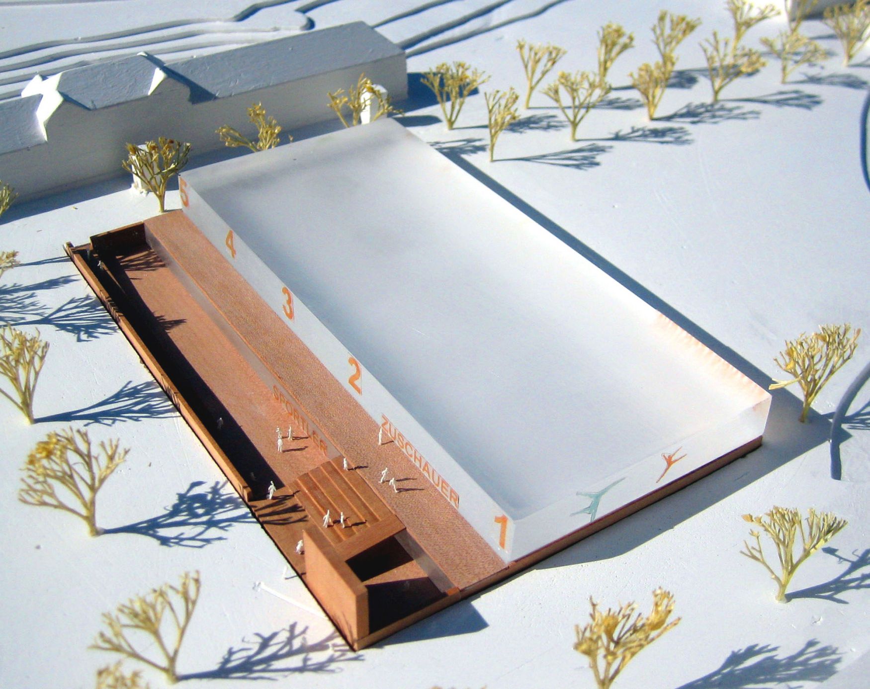 Als schlichter, kubisch geformter Baukörper mit einem entlang der Ostseite vorgelagertem Lichthof präsentiert sich die neue Sporthalle. Durch Absenken der Hallenebene um -2.00m gegenüber dem bestehenden Gelände wird das sichtbare Volumen deutlich reduziert und die Höhenentwicklung des Gebäudes an die umgebenden Schul- und Internatsbauten angepasst.