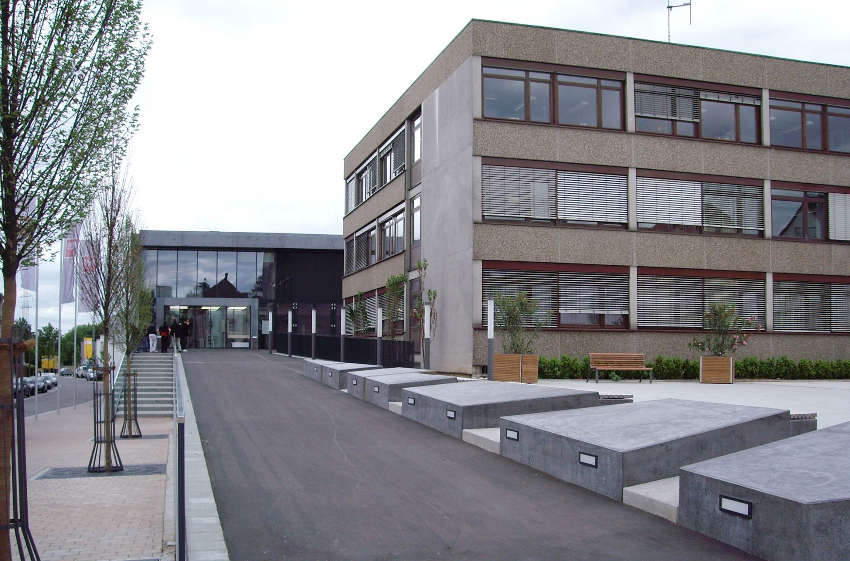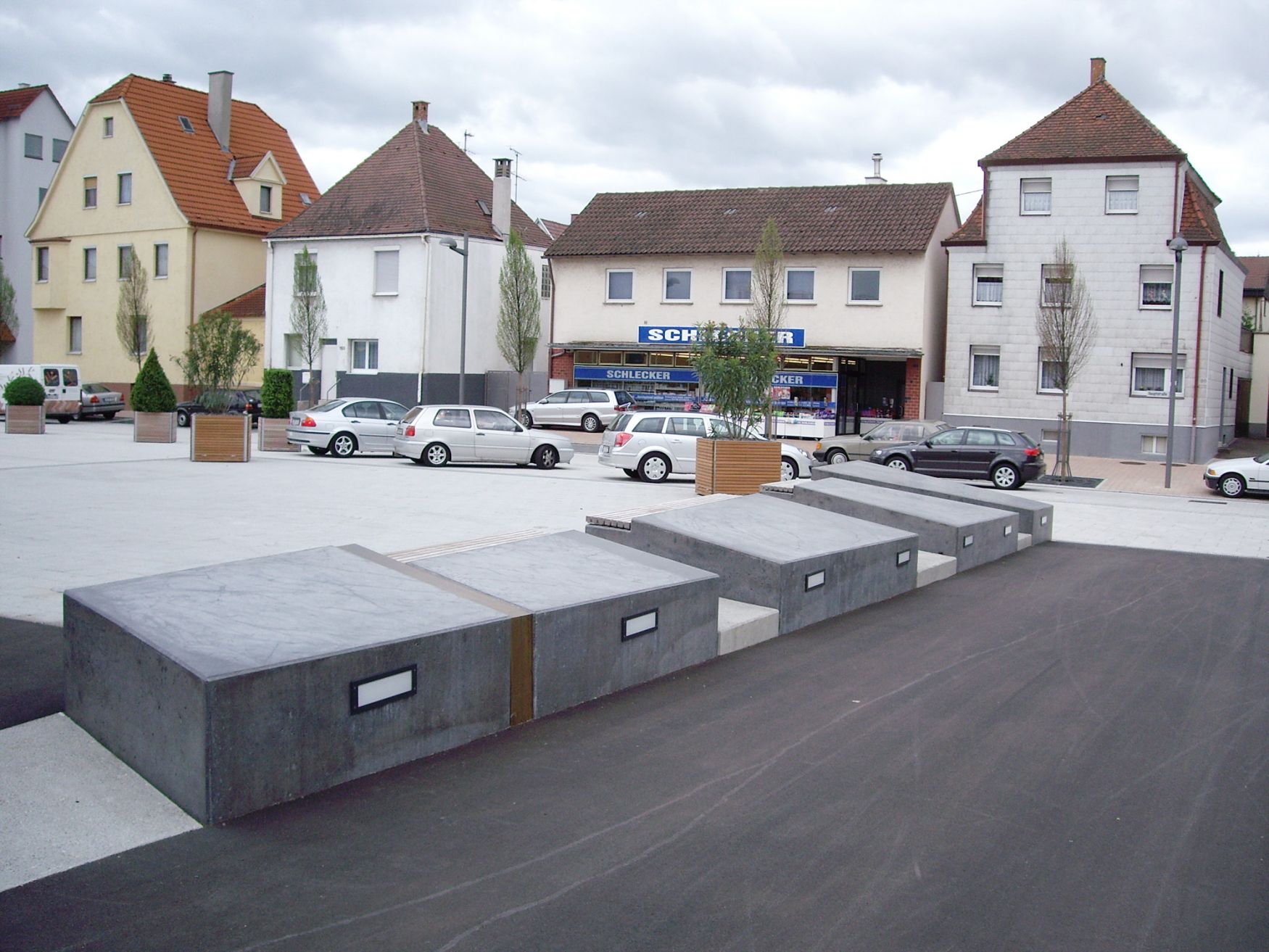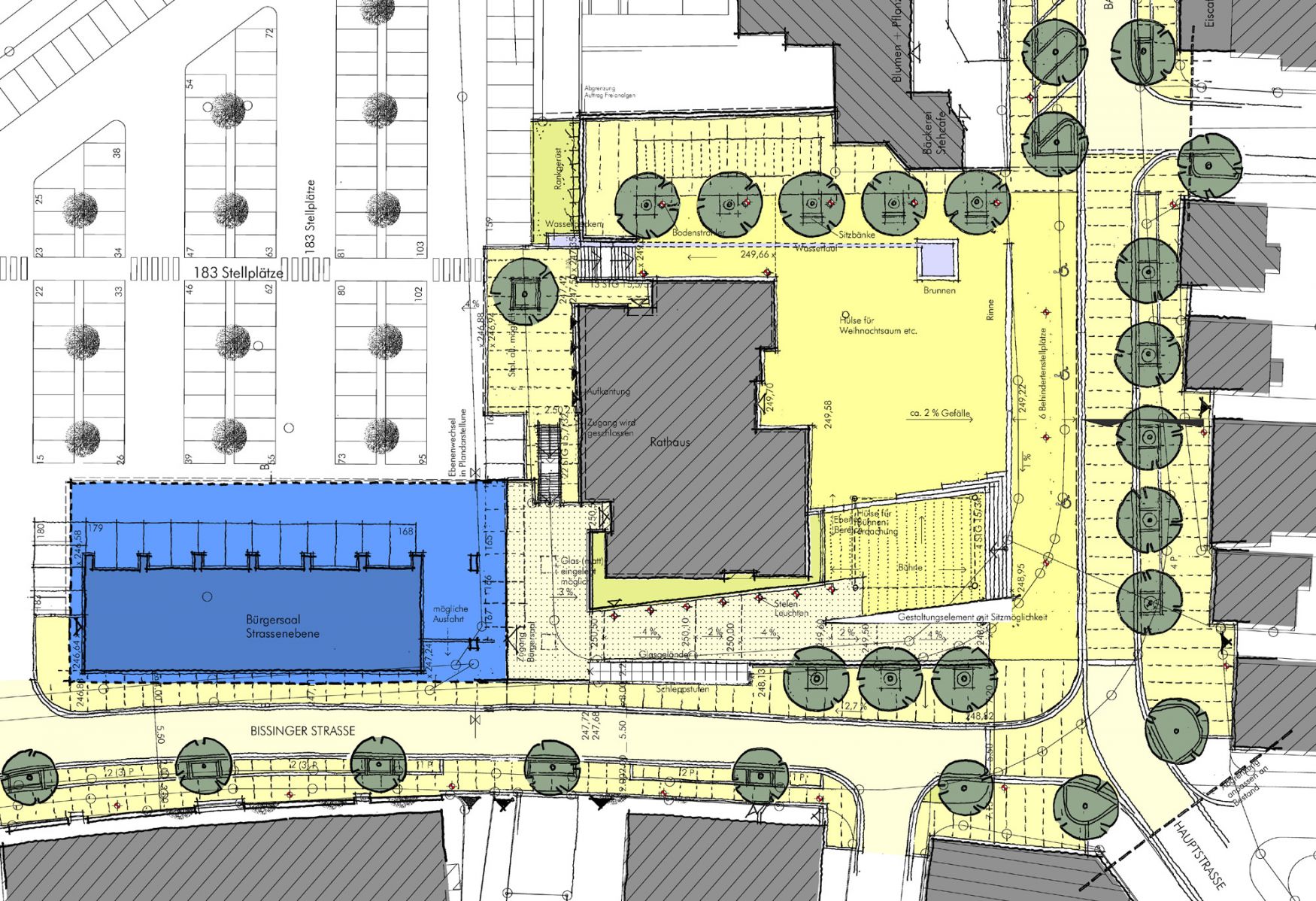 Schaffung einer befahrbaren attraktiven, flexibel nutzbaren Platzfläche für Veranstaltungen aller Art. Attraktiver Zugangsbereich zu gleichzeitig erstelltem Bürgersaal. Verbindung zu tieferliegendem Parkplatz mit Standort für temporäre Bühnen.