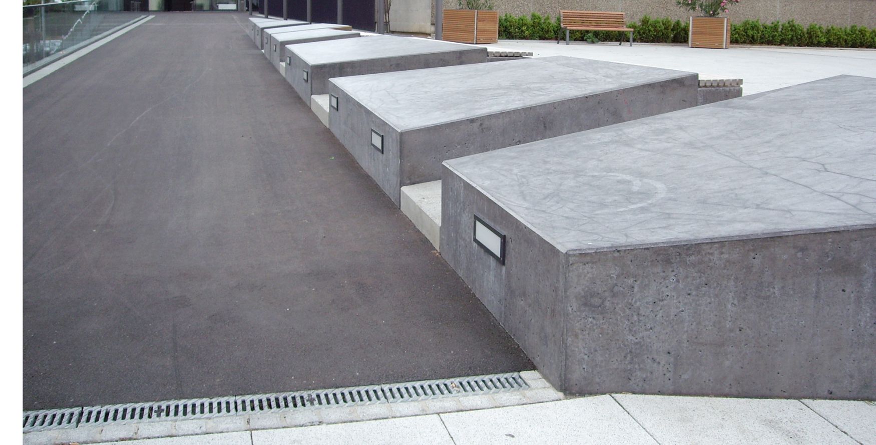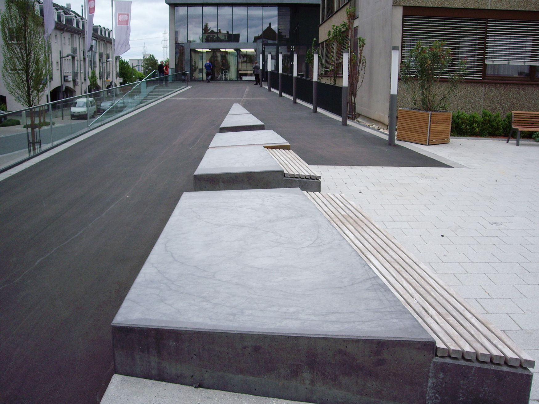 Zugangsbereich Bürgersaal mit Auftakt als artifiziellem Gestaltungselement zum Sitzen, Durchschreiten und optischer Blickfang, angeordnet als Wegteiler zwischen Rampenzufahrt und Bühnenfläche.