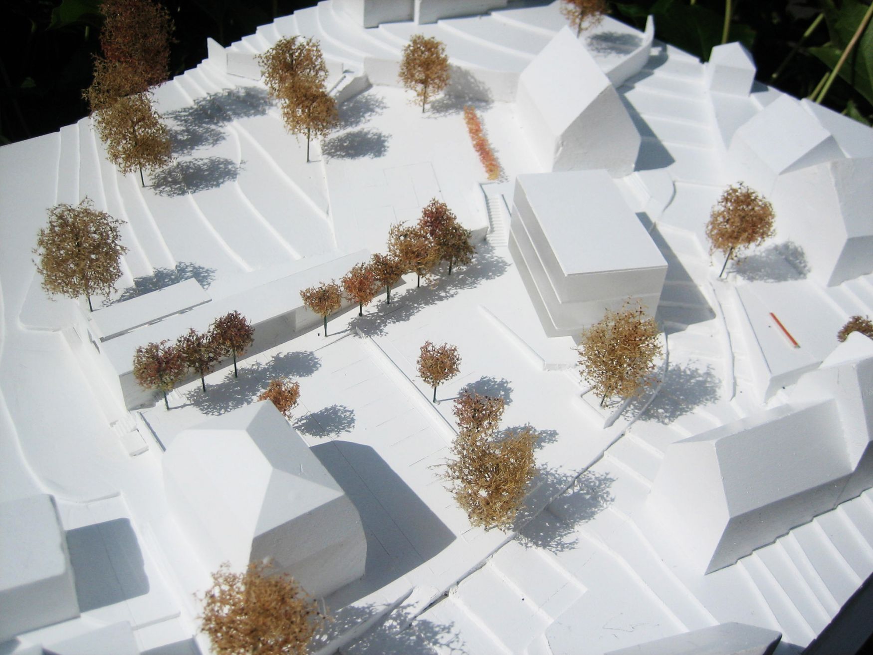 Ausgehend von einem attraktiven neuen Rathausplatz, welcher über den Kreuzungsbereich hinweg auch die Einmündung Schulstraße mit einbezieht, entwickelt sich zwischen dem Rathaus und der geplanten Rathauserweiterung eine Mauerscheibe, die thematisierte Friedhofsmauer, an der sich mehrere Funktionen anbinden.