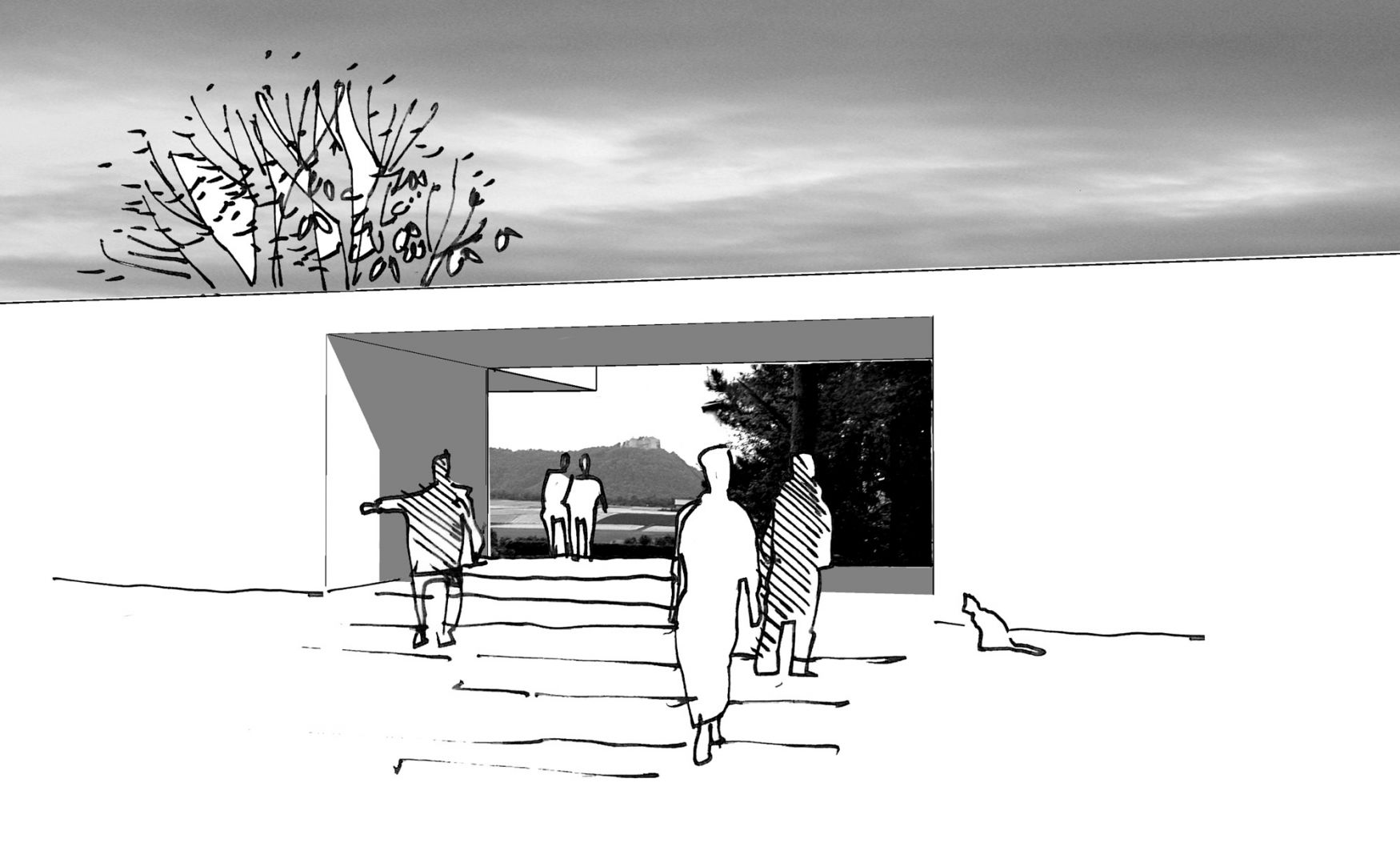 Talseitig befindet sich der Aufbahrungsbereich. Die einzelnen Räume werden zenital belichtet und erhalten damit eine würdige Atmosphäre. Vorgelagert ist eine großzügige überdachte Vorzone, die den sensiblen Bereich des „Abschiednehmens“ schützt und einen räumlichen Vorbereich zwischen den Trauernden und den Aufbahrungsräumen schafft. Unter diesem gedeckten Bereich bietet sich ein Panoramablick über das Neckartal.